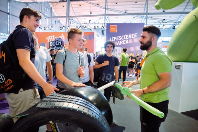 Auf über 280 Quadratmetern präsentiert der Arbeitgeberverband der Deutschen Kautschukindustrie (ADK) gemeinsam mit den fünf Mitgliedsunternehmen Goodyear Dunlop, KKT Frölich, Mapa, Motzener und Pirelli die spannende Welt der Kautschukindustrie. Mit vertreten sind außerdem das Deutsche Institut für Kautschuktechnologie (DIK) und der Wirtschaftsverband der Deutschen Kautschukindustrie. Auszubildende der Unternehmen und Mitarbeitende des DIK präsentieren 18 spannende Exponate zum Mitmachen und Ausprobieren und geben Berufs- und Studieninformationen aus erster Hand.