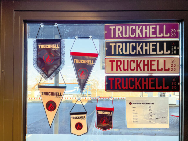 Es ist eine Autobahn-Raststätte wie jede andere. Nur die Wimpel hinter der Fensterscheibe, auf denen in leuchtend roten Buchstaben „Truckhell“ steht, verraten mir, dass ich genau richtig bin: Von hier stammen die rot-weißen Lastwagen-Namensschilder, die in immer mehr Windschutzscheiben auf den Autobahnen zu sehen sind. Hinter der Marke „LKW-Hölle“ steckt Benedikt Jütte, der seinen schwarzen Truck vor dem Autohof Holdorf parkt und mir beschwingten Schrittes entgegeneilt. Er sei noch kurz bei der Arbeit aufgehalten worden, sagt Jütte, der eigentlich als Key Account Manager arbeitet. Vor knapp zwei Jahren entwickelte er zusammen mit den Brüdern Markus und Ole Nirwing nebenbei die App „Truckhell“, mit der sich Lastwagenfahrer aus ganz Deutschland untereinander vernetzen können.