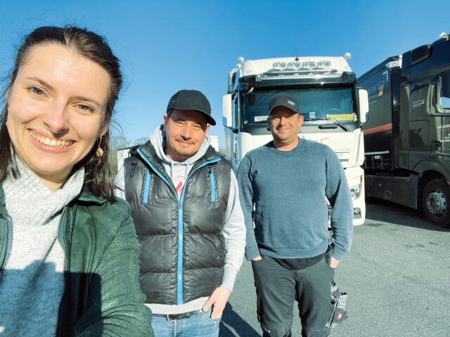 Unter Truckern: Rundblick-Redakteurin Audrey-Lynn Struck, Truckhell-Gründer Benedikt Jütte und Trucker Michael (v. l.)