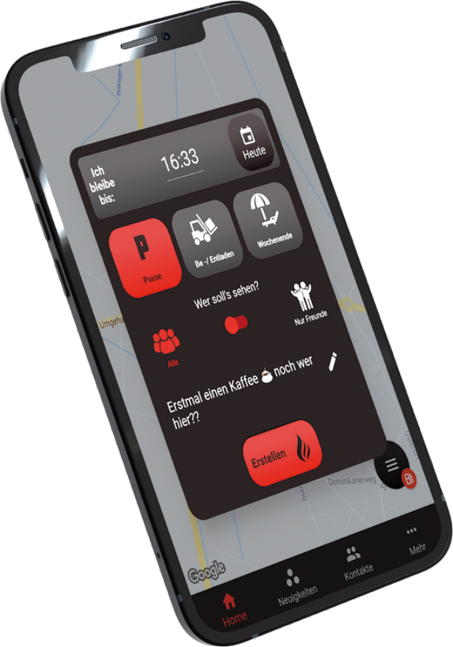 Ein Blick auf die Deutschlandkarte verrät dem Kölner Michael, wo sich andere Fahrer gerade aufhalten. Wann immer jemand eine Pause oder Urlaub macht oder anhält, um den Lastwagen zu be- und entladen, kann er es öffentlich oder privat mit seinen Freunden teilen. Mit einem Klick kann Michael sich über Google Maps zu anderen Fahrern leiten lassen. Nach einem Update sollen die Truckhell-Nutzer bald auch noch ihren Live-Standort beim Fahren teilen dürfen, verrät Jütte. Außerdem sind alle Raststätten und Parkplätze auf der Deutschlandkarte verzeichnet. „Die Autohöfe bekommen langfristig einen eigenen Account und können dann ihre Speisekarte oder sonstige Aktionen hochladen“, sagt Jütte. Bisher hat nur der Eurorastpark Münchberg in Oberfranken ein eigenes Profil.