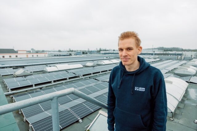 Maximilian Zarte ist seit August 2022 Energiemanager bei der Jäger Group. Er zeigt das Dach des neuen Bürogebäudes, auf dem jede verfügbare Fläche für Solaranlagen genutzt wird.