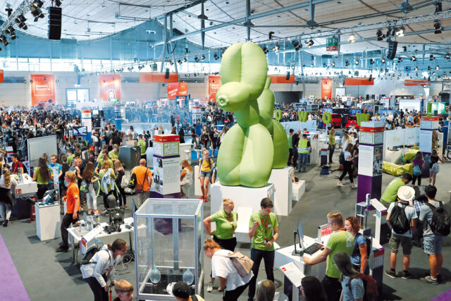 Bei der IdeenExpo 2022 hat auch Stephan Schulze einen Besuch auf dem Stand der Kautschukindustrie fest für seine Schülerinnen und Schüler eingeplant. Für den 46-jährigen Lehrer des Tilmann Riemenschneider Gymnasiums (TRG) in Osterode dreht sich eigentlich alles um Erdkunde und Spanisch. Doch wenn IdeenExpo angesagt ist, geht es für ihn und seine Schülerinnen und Schüler auf nach Hannover. Seit 2009 ist er mit seinen Klassen Stammgast auf der Technikshow. 2022 hatte der sympathische Lehrer vier Busse bestellt, gesponsort vom ADK. 200 Schülerinnen und Schüler aus 8 Klassen waren sofort bereit, mit zu Europas größtem Mitmachevent für Naturwissenschaften und Technik zu fahren. Auch Caro gehörte dazu, sie machte sich mit ihrer Klasse 10 c vom TRG auf den Weg nach Hannover. „Die IdeenExpo hat einen super Ruf“, sagt sie. Auch sie wurde nicht enttäuscht: Die Hallen waren brechend voll, es wuselte auf den vielen Ständen. Bonzo der grüne Ballonhund ist natürlich der Sympathieträger auf dem Stand. Doch auch die vielen Aktionen unter dem Motto „Gib Gummi“ fanden großen Anklang. Hüpfende Flummis, quietschende Reifen, schicke Babyschnuller und jede Menge kleine Ballonhunde – fünf Mitgliedsfirmen des ADK zeigten zusammen mit dem Wirtschaftsverband und dem Deutschen Institut für Kautschuktechnologie, was Kautschuk für junge Leute so spannend macht.